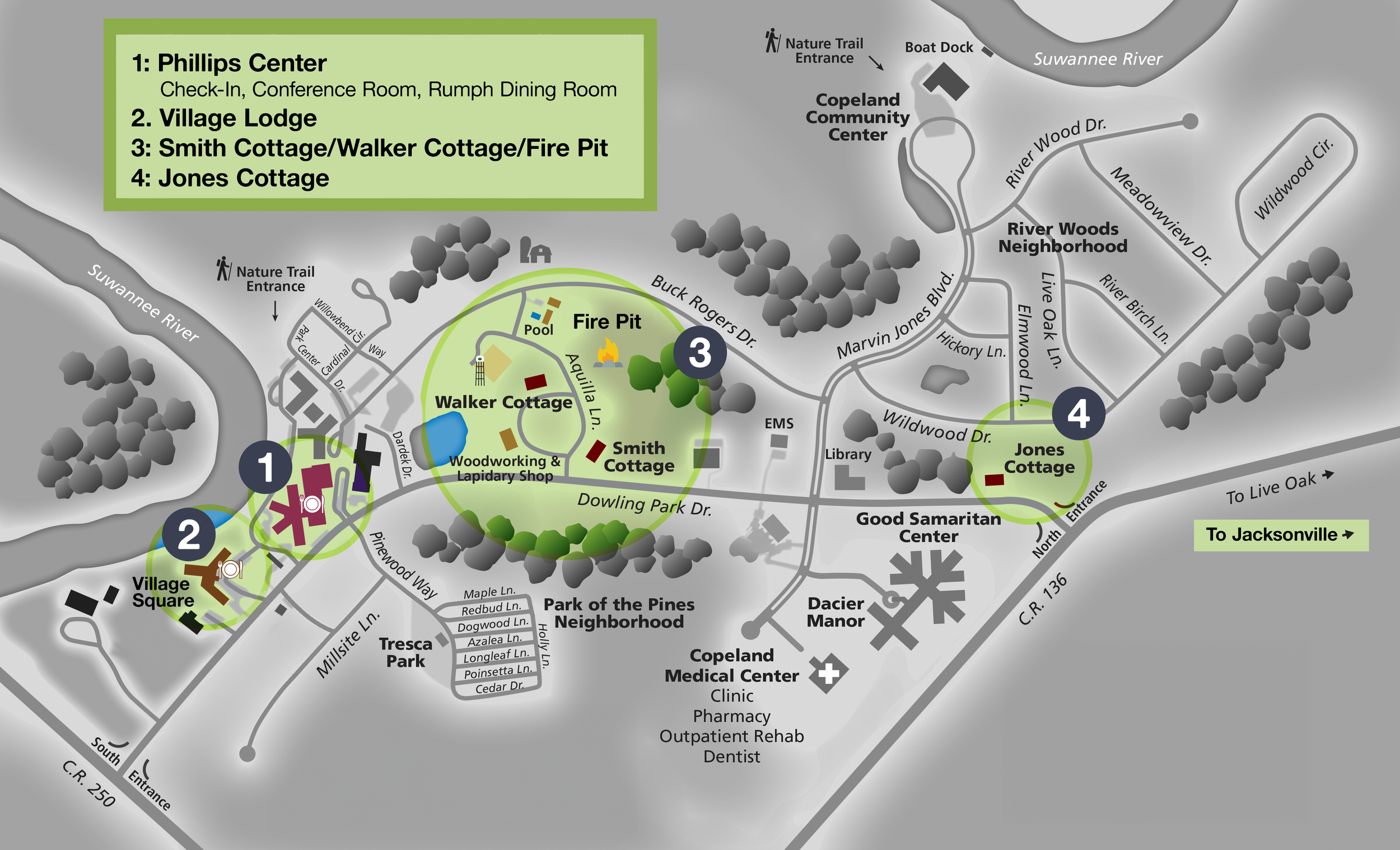 Once You Arrive: After you turn into Advent Christian Village, continue straight on Dowling Park Dr. until you reach the Phillips Center. Turn right into the Phillips Center parking lot and park there. You can then check in and receive your lodging details (you will be staying at either the Village Lodge located at Village Square, the Smith Cottage, or the Jones Cottage — see map below for more details). Check-in will take place inside the Phillips Center, just outside the Sawmill Room. All sessions will be held in the Sawmill Room, with meals served nearby in the Rumph Dining Room.